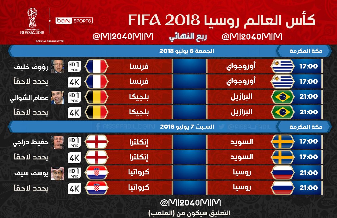 جدول معلقي مباريات ربع نهائي كاس العالم 2018 على Bein Sports