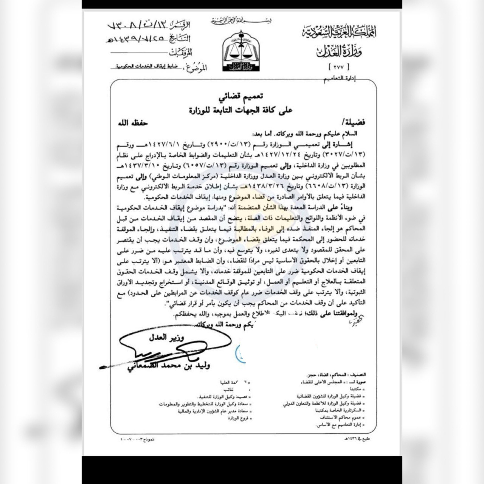 أوضحت وزارة العدل أن رفع إيقاف الخدمات بسبب التعثر في سداد القروض يتم من خلال ثلاثة ضوابط فقط وتتمثل في سداد كامل المبلغ أو موافقة طالب التنفيذ على المهلة أو من قبل الدائرة القضائية إذا ترتب على ذلك ضرر عام.