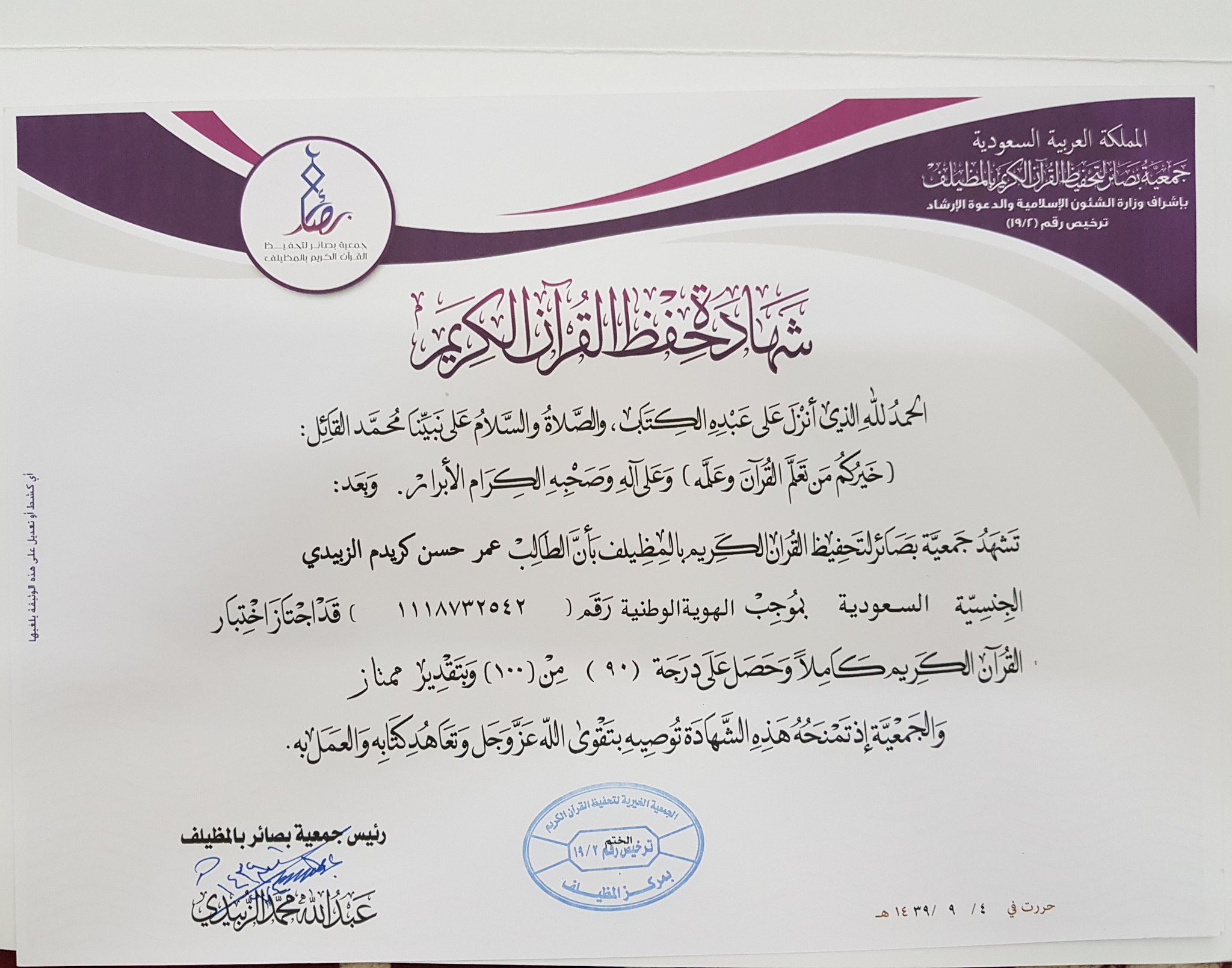 د حسن بن كريدم الزبيدي On Twitter في شهر رمضان شهر القرآن حصل ابني عمر على شهادة اجتياز حفظ القرآن الكريم فلك اللهم المحامد كلها شكرا جمعية بصائر على كريم جهودكم ومبارك ياعمر