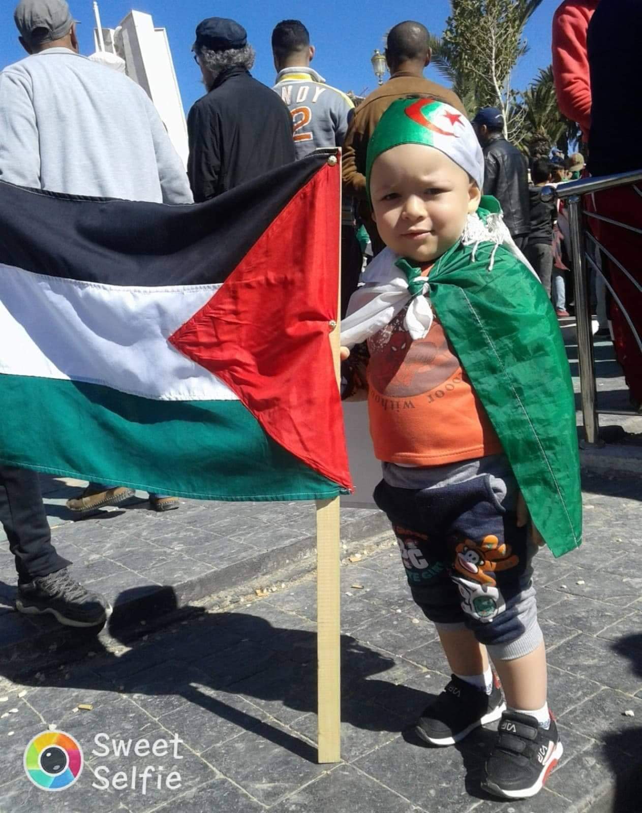 علم فلسطين في مظاهرات الجزائر. على أصوات الطبول وهتافات ورقصات الشباب. 1 مارس 2019. مظاهرات ضخمة تقترب من قصر الرئاسة الشرطة تتصد ى لمحاولة اقتحام التلفزيون وتصاعد في الإصابات.