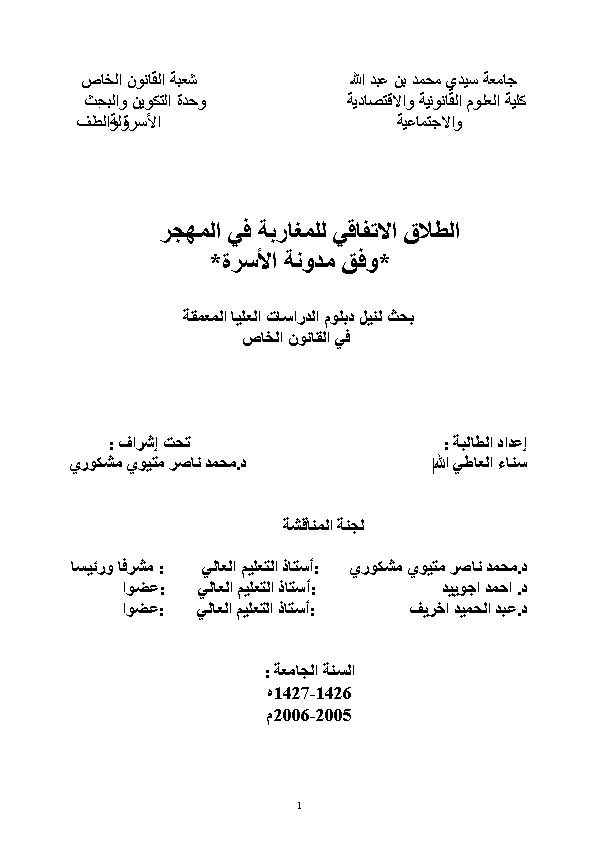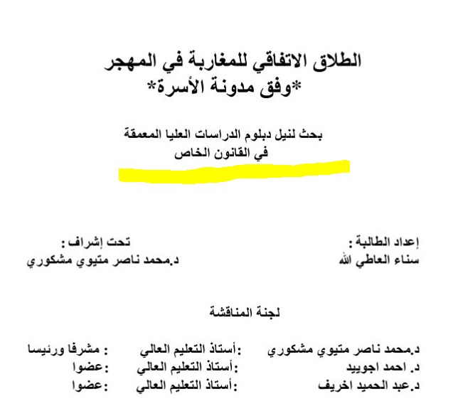 رسالة لنيل دبلوم الدراسات العليا المعمقة في القانون الخاص تحث عنوان الطلاق الإتفاقي لمغاربة المهجر Pdf