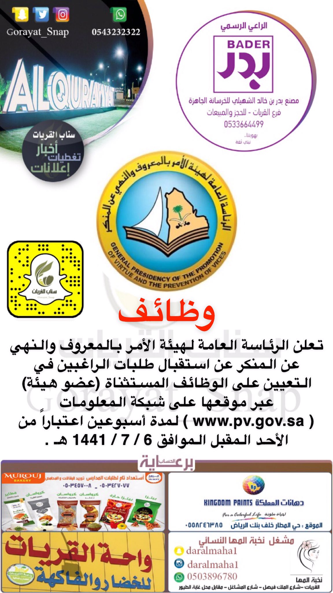 سناب القريات نعود بحذر على تويتر وظائف تعلن الرئاسة العامة لهيئة الأمر بالمعروف والنهي عن المنكر عن استقبال طلبات الراغبين في التعيين على الوظائف المستثناة عضو هيئة عبر موقعها على شبكة